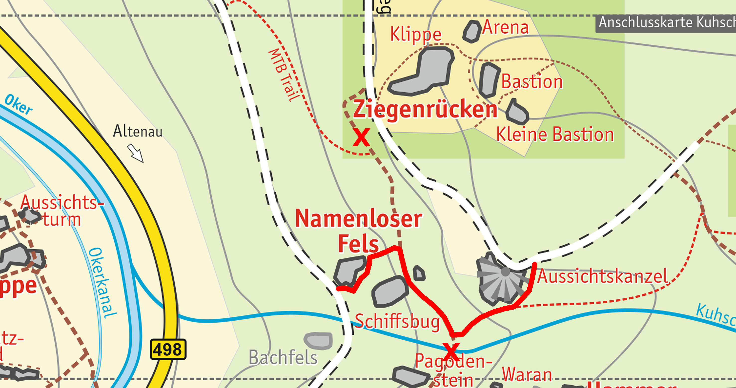 Das Wegstück zwischen MTB-Trail und Ziegenrücken (X in der Karte) soll zeitnah ebenfalls wieder begehbar gemacht werden.
